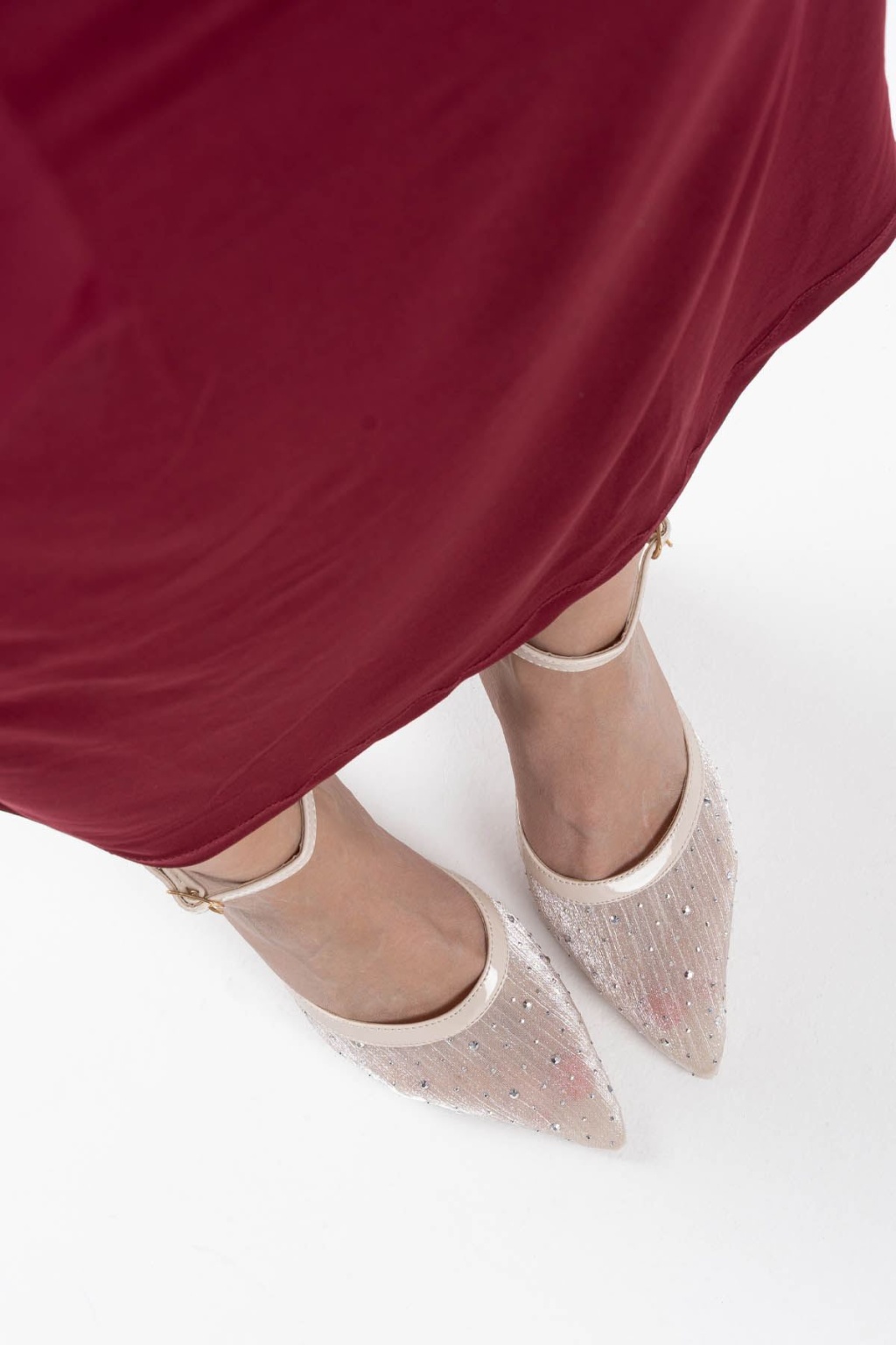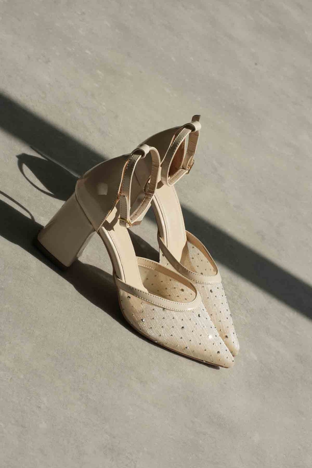 Borie Bej Tekstil Kumaş Taşlı Kadın Topuklu Ayakkabı